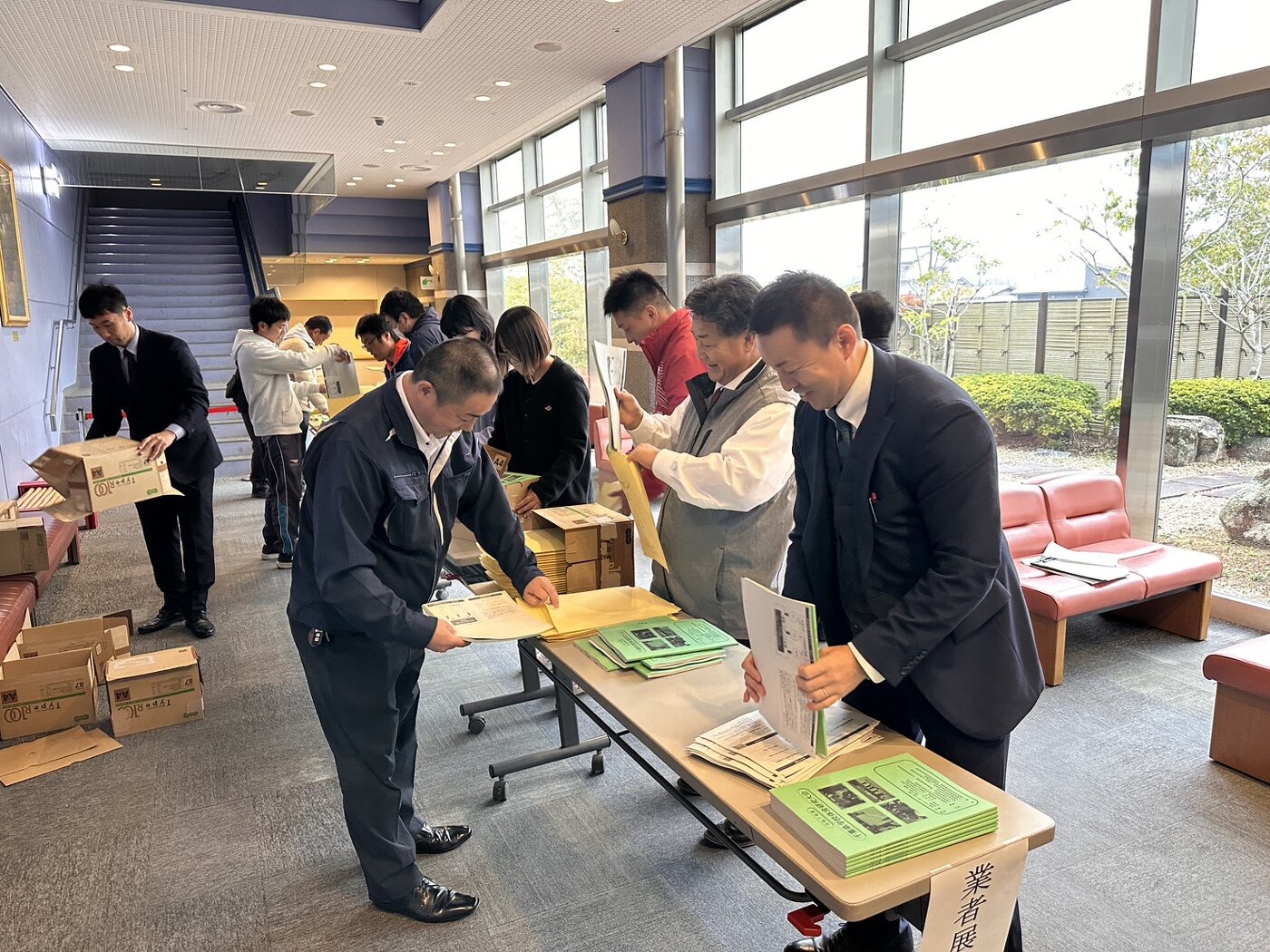 県内体育の先生方と笑顔で準備に励む事務局長