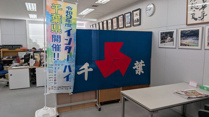 あけましておめでとうございます。 本年もどうぞよろしくお願いいたします! 令和9年度南関東総体の千葉県競技のぼり旗が完成し、高体連事務局に届きました。県教委総体準備班の皆さんの渾身作です! インターハイの事をもっと知ってもらえるよう宣伝していきます!