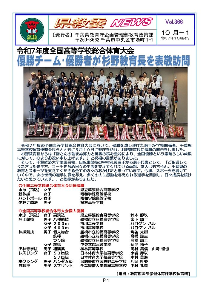 千葉県教育委員会の「県教委ニュース」に9月10日の全国総体優勝報告会に関する内容が掲載されました! 県HPはこちらから! 県教委ニュースは千葉県HPを中心に教育情報を広く発信しているものになります。これ...