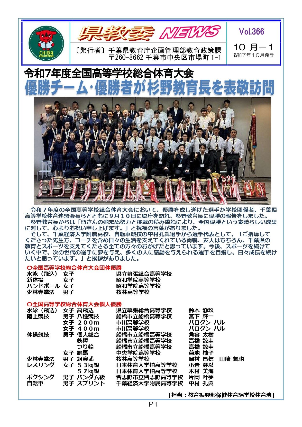 千葉県教育委員会の「県教委ニュース」に9月10日の全国総体優勝報告会に関する内容が掲載されました! 県HPはこちらから! 県教委ニュースは千葉県HPを中心に教育情報を広く発信しているものになります。これにより、高校だけでなく小・中学校関係者や多くの県民の目にも触れ、選手や学校の活躍がより広まることに繋がります。高体連としても非常に喜ばしいことです。 改めて、優勝選手及び優勝校の皆さん、おめでとうございます!